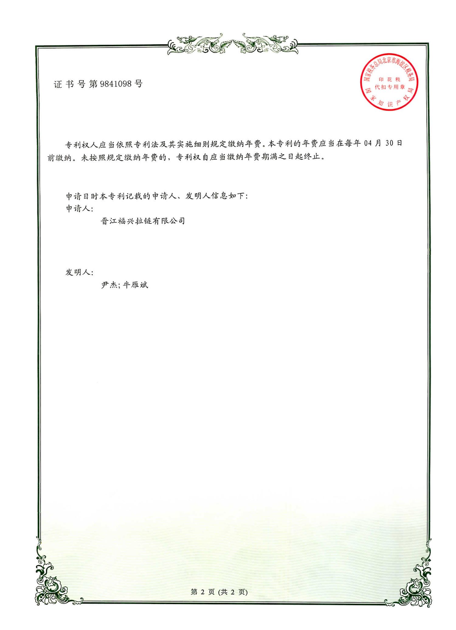 实用新型发明专利(第9841098号)
